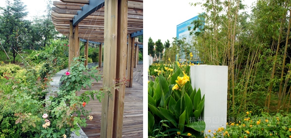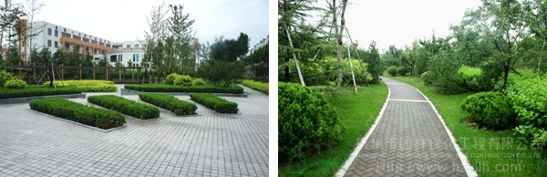 每個景觀節點上,植物的配置方法都是不一樣的,如在下沉廣場,主要是以小龍柏、金葉女貞等小灌木片植成方形或弧形,間或點綴石楠、梅樹,看起來規整、簡潔;而在設計風格為江南園林的南廣場上,是將貴重的造型油松單植,通過不同的組合,形成三個風格相近的綠島,周邊種植美人蕉、玉簪、竹子,并砌起白墻,上面開圓形拱門或圓窗,散發出詩意江南的靜謐和婉約氣息?!坝雾降朗秦灤┱麄€景觀的軸線,為了形成曲徑通幽的景觀效果,我們將對植、孤植、叢植都多種方法結合運用,特別是在三叉路口,多種植海棠、櫻花、杏花等,一方面,花開的時候,綠葉間繁花點點,會吸引人們不斷向前探尋更多的美景;而花落之后,茂密的枝葉又形成隱隱約約的視覺感受,前方轉過彎后風景什么樣,又讓人很想去看看?!备呓浝硇χf。