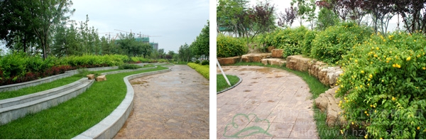 為了配合每個景觀節點的風格,園路的鋪裝材料和手法各不相同。據高經理介紹,工程中用到的鋪裝材料主要有汀布石、印花地坪、文化石、青磚、荷蘭磚、花崗巖等,其中,印花地坪是一種新型的鋪裝材料?!坝』ǖ仄褐饕迷诒睆V場上,其工藝為:在混凝土上面灑上特殊的配料,整平之后,再用模具一塊一塊壓出形狀,最后用特殊的膠水封膜,這種施工方法工藝新穎,花樣和顏色比較多,雖然工藝較為復雜,但是景觀效果非常好,遠遠看去,就如盛開在腳下的‘花?!?,一路迤邐而去。”高經理說,“其他的鋪裝材料雖然比較常見,但我們在鋪裝工藝上進行了創新,如在下沉廣場的廊架旁,我們用黑色的鵝卵石與芝麻灰的花崗巖搭配,鋪出來的路面呈現出立體感,這種鋪裝工藝是借鑒了室內裝飾的手法,通過改造,用于室外鋪裝,遠遠看去,就像一級一級的臺階,帶動了周圍的景觀也動起來。”