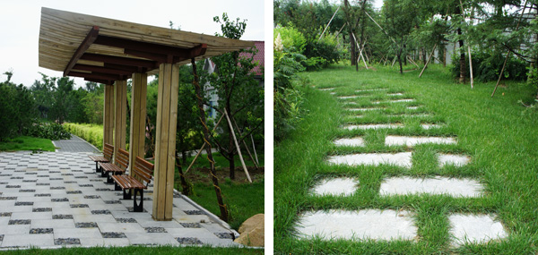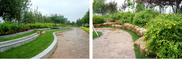 而在道路十字路口的節點處,則主要是用10cm×10cm的小花崗巖鋪地,鋪出來的路面整潔、平坦,看似簡單,實則對施工技術要求相當高。草坪中的地面鋪裝,則采用花崗巖汀步,用錯縫鋪裝法,兩塊花崗巖之間用草皮鑲嵌,就像給每塊花崗巖鑲了一道綠邊,與旁邊的草坪和諧地融為一體。貫穿整個工程的游憩步道,全部采用"人字形"的鋪裝方法,中間用透水磚、兩邊以花崗巖鑲邊,透水磚價格不高,用以鑲邊的花崗巖是利用了鋪裝中剩余的邊料,雖然用料簡單,但通過對技術的嚴格要求,鋪出的路面卻整潔而不失韻味,是一種實用、環保、節約的做法。