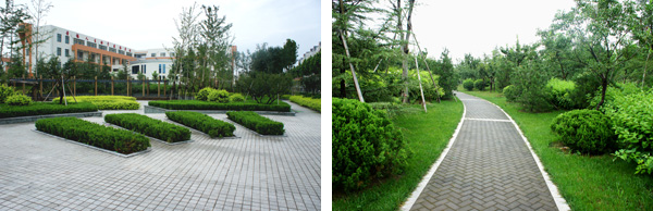 每個景觀節點上,植物的配置方法都是不一樣的,如在下沉廣場,主要是以小龍柏、金葉女貞等小灌木片植成方形或弧形,間或點綴石楠、梅樹,看起來規整、簡潔;而在設計風格為江南園林的南廣場上,是將貴重的造型油松單植,通過不同的組合,形成三個風格相近的綠島,周邊種植美人蕉、玉簪、竹子,并砌起白墻,上面開圓形拱門或圓窗,散發出詩意江南的靜謐和婉約氣息。"游憩步道是貫穿整個景觀的軸線,為了形成曲徑通幽的景觀效果,我們將對植、孤植、叢植都多種方法結合運用,特別是在三叉路口,多種植海棠、櫻花、杏花等,一方面,花開的時候,綠葉間繁花點點,會吸引人們不斷向前探尋更多的美景;而花落之后,茂密的枝葉又形成隱隱約約的視覺感受,前方轉過彎后風景什么樣,又讓人很想去看看。"高經理笑著說。
