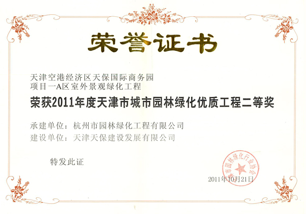 近日,由天津市園林綠化行業(yè)協(xié)會評選的“2011年度城市園林綠化優(yōu)質(zhì)工程”獲獎項目正式公布,其中,由杭州市園林綠化工程有限公司負責(zé)施工的“天津空港經(jīng)濟區(qū)天保國際商務(wù)園項目—A區(qū)室外景觀綠化工程”榮獲“2011年度天津市城市園林綠化優(yōu)質(zhì)工程二等獎”。