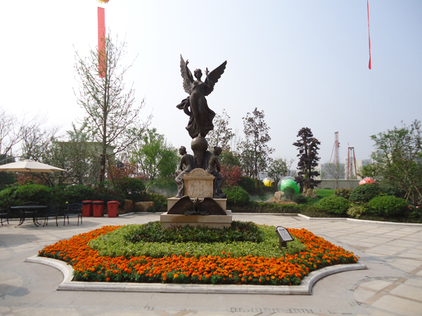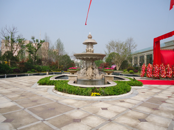 更引人注目的,還有銷售展示中心前面的雕塑噴泉,該噴泉運用花崗巖整石雕刻拼接而成,工藝極其復雜,自上而下不斷灑落的水花,營造出一片清涼;無以復加的鏤空鐵藝圓頂繁復花紋和拱門的石材立面裝飾的皇家景觀亭,精致中透露出大氣;潺潺溪流、霧氣繚繞的人工溪澗,如夢似幻;大面積的高爾夫果嶺草坪蜿蜒起伏,華貴雍容……