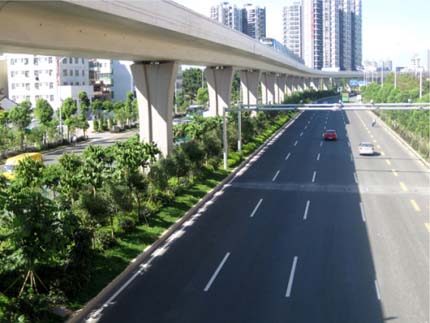 如今,開車行進在這條道路上,干凈整潔的路面、開闊通透的視野、清新自然的景觀,給人帶來閑適、愜意的感覺。“以人為本,尊重自然”的綠化理念,體現在景觀中的每個細節;自然環境與城市環境的密切結合,使高架橋的道路通行功能與橋下中央綠化帶的生態功能有機融合。整條道路,不僅體顯出深圳這個濱海大都市獨有的景觀特色,更彰顯出這個城市的生機活力與熱情奔放。