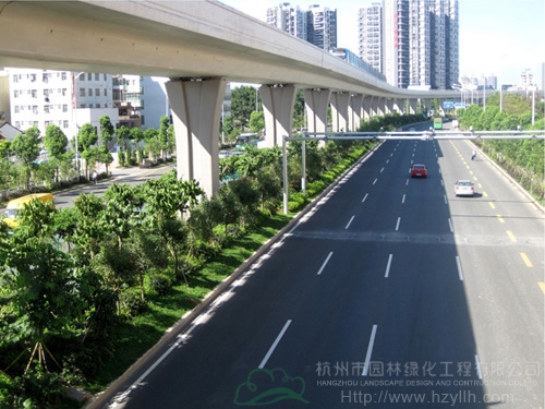 該工程最大的特色和亮點(diǎn)為:“以人為本,尊重自然”、“ 處處有綠葉,無處不飛花”等自然生態(tài)的設(shè)計(jì)理念貫穿始終;中央綠化帶位于高架橋下,長勢茂盛的各類植物形成一條繽紛絢麗的彩帶擁簇著高架橋段,使整條橋段與綠化景觀有機(jī)融合。2012年,該工程榮獲中國風(fēng)景園林學(xué)會(huì)“優(yōu)秀園林綠化工程金獎(jiǎng)”。