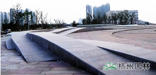 廣場根據(jù)功能不同,分為七大觀賞區(qū),分別是露天劇場、雕塑小品、人行路橋、活動廣場、異形種植池、滑板坡道、擋浪墻和波浪形臺階。