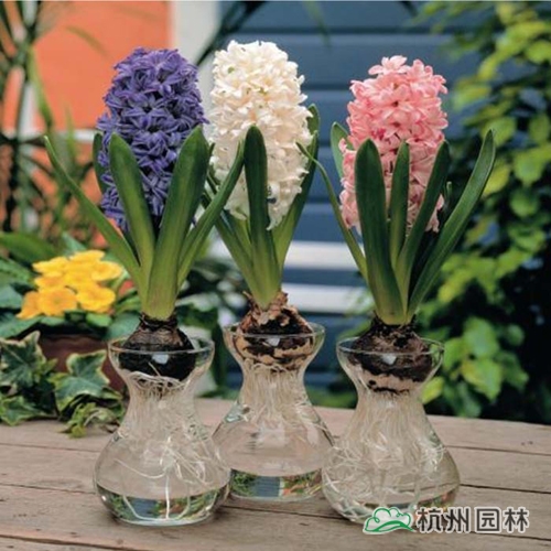 風(fēng)信子:目前市場(chǎng)上常見的風(fēng)信子有粉、藍(lán)、玫紅、紫、白等品種,其中以藍(lán)、粉、紫最受歡迎。選購(gòu)時(shí)要挑個(gè)頭大而飽滿的,抓在手上硬實(shí)偏重,根部不發(fā)霉,生長(zhǎng)點(diǎn)未受破壞的種球。11月下旬種植,在陰冷的環(huán)境下放置兩個(gè)月左右,這樣處理可以減少后期夾箭的概率,也有利于根系的生長(zhǎng),待花芽長(zhǎng)至5cm左右時(shí)移至光線充足的區(qū)域即可。風(fēng)信子也可水培,但較盆栽一般花箭短、花朵少,花期也會(huì)短一周左右。