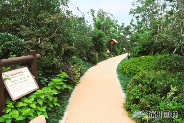 五千年的中國歷史文化,恢宏浩瀚,為園林造景提供了取之不竭的素材;園林景觀,也因?yàn)閭鞒辛松詈竦奈幕滋N(yùn)而散發(fā)出獨(dú)特的藝術(shù)魅力。作為一個(gè)旅游度假項(xiàng)目,對(duì)園林景觀的要求,不僅僅只是精致大氣、風(fēng)韻天成的美景,更需要有深厚的文化底蘊(yùn),彰顯獨(dú)一無二的中國元素。為此,在2號(hào)樓大廳門前,用植物造景再現(xiàn)代表中國書法中筆畫大體的“永”字八法,彰顯中國書法的魅力;在泡池的建造上,運(yùn)用老石碾、壓門石、老磨盤等老石材,打造出懷舊氣息濃郁的鄉(xiāng)土風(fēng)情。