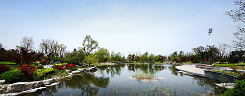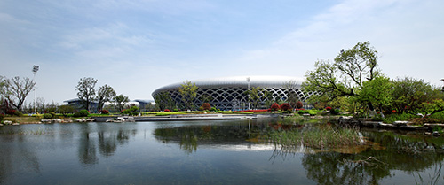據(jù)夏修智介紹,奧體公園是工程的主要景觀節(jié)點(diǎn),位于奧體中心西北側(cè),面積約5萬(wàn)平方米,是一座集娛樂(lè)、運(yùn)動(dòng)為一體的特色濱水運(yùn)動(dòng)公園,也是整個(gè)奧體中心的“綠肺”。一條蜿蜒的河流將公園劃分為東部運(yùn)動(dòng)區(qū)和西部休閑公園區(qū)。運(yùn)動(dòng)區(qū)緊挨訓(xùn)練中心,東側(cè)便是足球場(chǎng)、籃球場(chǎng)和排球場(chǎng),運(yùn)動(dòng)后就能感受到融入大自然的清新;休閑公園區(qū)包括入口廣場(chǎng)、樹(shù)陣廣場(chǎng)、以及河水匯聚而成的小人工湖,湖邊蘆葦迎風(fēng)擺動(dòng),湖水清澈見(jiàn)底,鵝卵石鋪就的湖底清晰可見(jiàn)。整個(gè)奧體公園以中國(guó)古典園林為主、回歸自然的組團(tuán)式造景手法,強(qiáng)調(diào)休閑、幽靜、生態(tài)自然。從西入口廣場(chǎng)的草坡,逐漸過(guò)渡到觀賞性強(qiáng)的觀花、觀葉園林樹(shù)種,配合灌木、草木、地被形成人為景觀,從西到東植物次第減少,層次不斷變化,形成了從自然生態(tài)狀綠化到人工幾何狀綠化的逐漸過(guò)渡,讓自然的活力與體育精神融為一體。