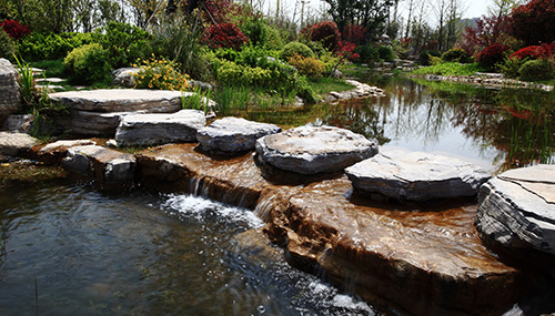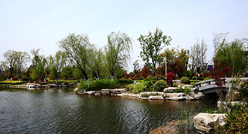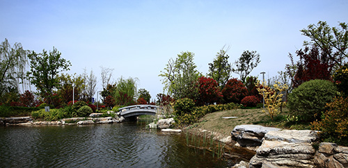 其中,人工湖面積7000平方米,小而精致,可謂是整個(gè)公園的“點(diǎn)睛之筆”。由親水平臺(tái)區(qū),源頭區(qū),中心湖面區(qū),鄰水生態(tài)區(qū),橋梁區(qū)構(gòu)成。湖面區(qū)域貫穿整個(gè)工程,沒(méi)有自然條件的襯托,完全由人工園林造景手法完成,在鄰水景觀帶種植睡蓮、荷花、再力花、千屈菜、鳶尾、蘆葦?shù)人参铮瑺I(yíng)造生態(tài)岸線(xiàn),同時(shí)選擇其他親水植物,如美人蕉、碧桃、楊柳、水杉作為過(guò)渡和背景,虛實(shí)結(jié)合,營(yíng)造出多方位的景觀效果。湖面雖小,但結(jié)構(gòu)完整,假山疊水,拱橋,原石臨水橋,湖邊卵石生態(tài)群落一應(yīng)俱全。其中,景石主要使用了安徽的靈璧景石,約7000噸,堆疊出水源、暗橋、親水沿岸等景觀。