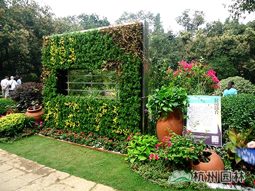 走進畫境園,只見主入口左側種植著兩株一高一矮的厚皮香樹,郭昌如笑著說,“這兩棵厚皮香寓意的是兩個萬分自豪的森林衛士——熊大和熊二,你看,熊二還滿臉熱情地向游人不停地招手示意呢?!敝魅肟谟覀仁且幻媪Ⅲw綠植墻,所用的植物主要為黃金絡石、金寶石冬青、小葉梔子花、金邊黃楊等。“立體綠植墻是立體綠化的主要形式,畫境?青山湖花園中心推出的這款立體綠植墻產品,可以根據客戶需要,結合氣候、溫度、濕度、色彩等綜合條件,選配四季長綠或色彩豐富的植物,隨時在人們想要的地方構建出一個貼近自然又超脫自然的生活環境,可謂是簡單又方便。”郭昌如介紹道。立體綠墻的兩側,隨意地散落著一些紅陶罐,與金寶石冬青、龜甲冬青等精品球形植物,三角梅、月季、常春花、雞冠花等花卉,紫葉狼尾草、晨光芒、矮蒲葦等觀賞草混搭,營造出一種溫暖、和煦的庭院景觀?!叭绻丫G植墻看成是城市的建筑,此景則喻意美麗杭城的繁華一角。”郭昌如補充說。綠植墻的中間還別出心裁地設置了一扇窗戶,透過它,園內的美景已隱約可見。