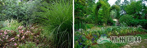 擋墻后采用柳葉馬鞭草+翠蘆莉分帶種植,并點綴穗花牡荊的手法,形成錯落有序、整齊卻不單調的英式鄉村院落景觀。