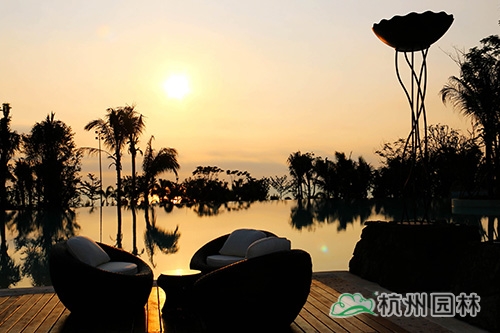 項目位于海南省三亞市亞龍灣椰風路南部,整體景觀顯得張弛有度,開闊大氣的廣場鋪裝、宛若綠色地毯般的草坪、色彩豐富長勢茂盛的植物、藍寶石般的碧藍泳池……規整中不失自然,簡潔中深藏精致,盡顯現代主義風情的園林美景。