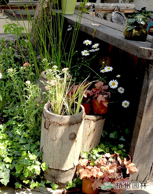 庭院一角,兩株大濱菊、三兩陶罐,一叢水蔥、幾株礬根、蓍草、金線蒲,形成簡潔但不簡單的景觀。