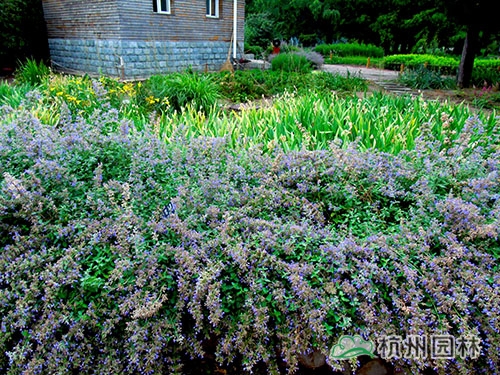 荊芥叢生狀明顯,莖葉常呈匍匐狀,花量大,色澤較淡,常出現在較古樸的花境景觀中,可用于軟化建筑、巖石、松柏等生硬的線條。