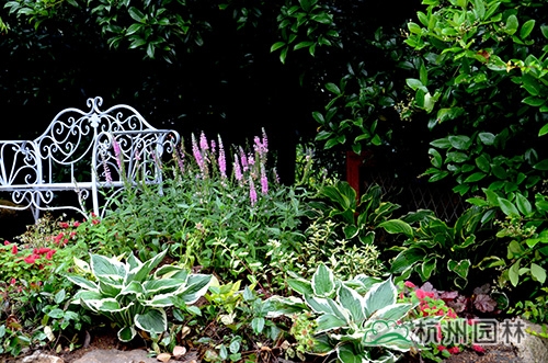 英式花境中,以穗花婆婆納為焦點,通過花葉玉簪、礬根、檸檬羅勒、紅尾鐵莧、花葉絡石的配置,并與鐵藝座椅形成愜意的休閑氛圍。