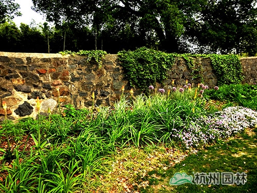 火炬花與地錦球形成墻垣花境的獨特風景。