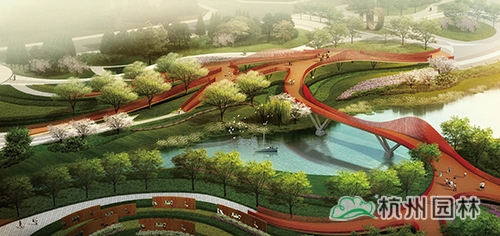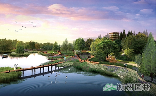 方案對原有坑塘進行綜合改造,由一系列下沉式綠地、景觀池塘形成雨水濕地,通過藝術化設計手法,大量運用開花地被與水生植物,形成迷人的雨水濕地,使其如同綠色海綿般,讓城市具有適應環境的彈性,保障城市生態安全。