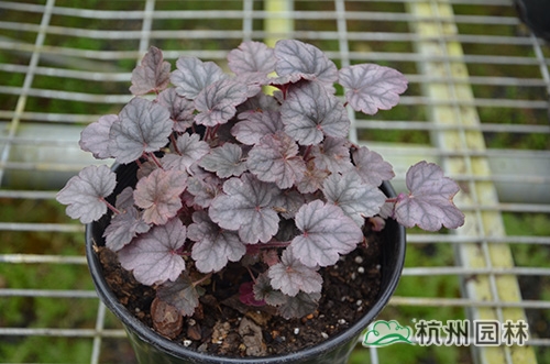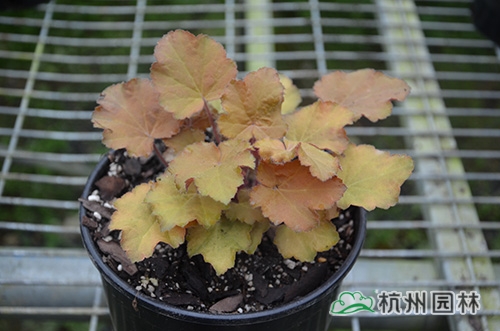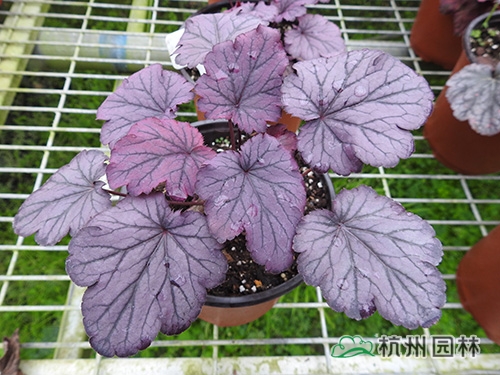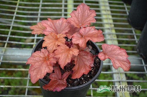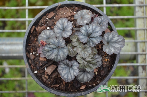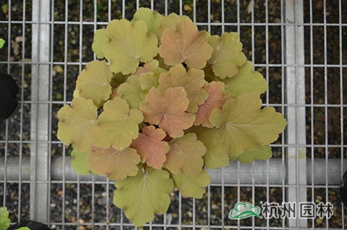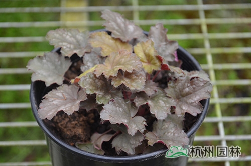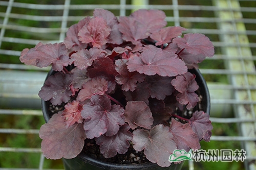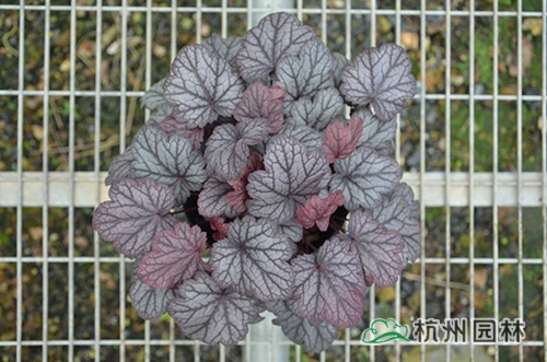 礬根又名小花腎形草,英文名為“Alum root”(因根部不規則膨脹而來),因此在引入中國的時候被翻譯成了“礬根”。礬根葉色繁多,且葉色會隨著季節、環境、溫度和光照條件的變化而改變。例如,‘蜜桃黃’在春天的時候,葉子展現出細膩的銀色光澤,成熟的葉片顏色會呈現紫色并略帶玫瑰紅;‘赤砂巖紅’的葉色會從桃紅色變為亮銅黃色,再變為綠色帶有琥珀色;‘貴族紫’葉子的顏色會保持穩定的紫色,冬天的葉子會變成銀色。