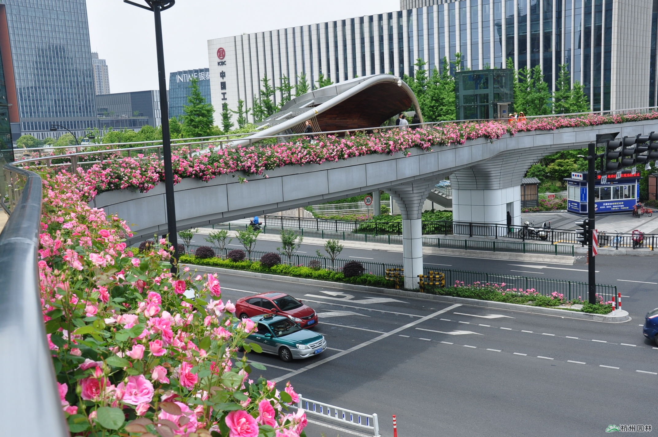 位于新塘路和慶春路交叉口的慶新天橋是新塘路綜合整治工程的標志性建筑之一,也是杭州首座仿生態(tài)學原理的異形人行天橋。橋面獨特的景觀造型宛如一條風景秀美的彩色飄帶,大量月季沿橋面外側護欄種植,月季花盛開時節(jié),橋面仿佛戴上了一條色彩絢麗的花環(huán),美不勝收,充分體現了杭州包容、大氣、開放的時代風貌、都市氣質和國際視野。