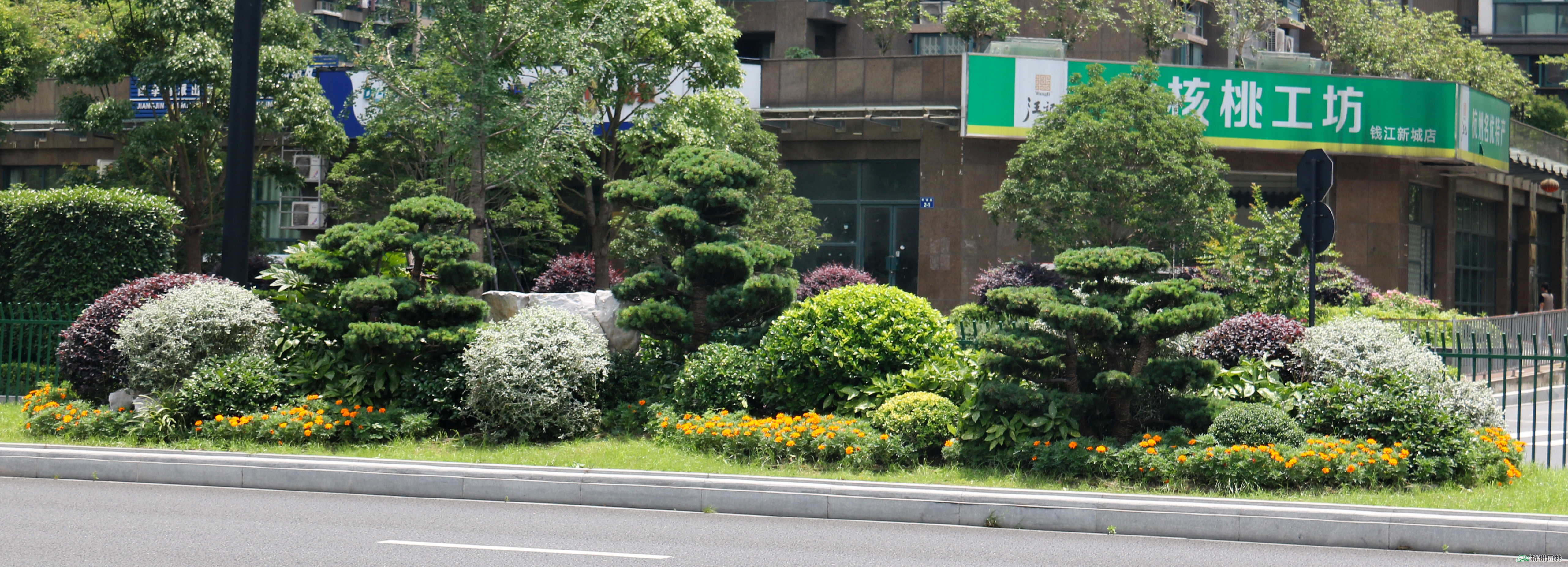 在道路十字路口及一些重要節(jié)點,則通過造型樹、球類植物、景石等的有機結合,采用盆景化的造園手法,景觀效果獨具特色。從而使得新塘路成為四季常綠、三季彩葉、全年花開不斷的“最美”迎賓大道。