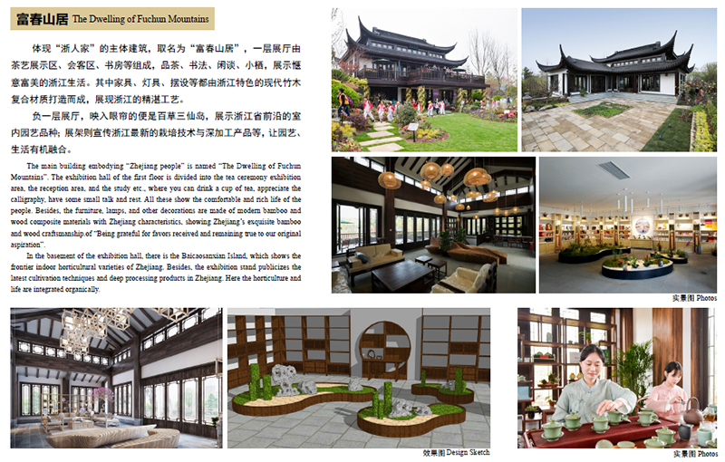 浙江園內(nèi)體現(xiàn)“浙人家”的主體建筑取名為“富春山居”,該建筑以浙派民居為原型,飛檐翹角,格局大氣,盡顯浙江風(fēng)情。深化這個建筑單體,團(tuán)隊做了很多功課,花了許多心思,考察了許多浙江特色民居,在充分運用現(xiàn)代建筑材料與結(jié)構(gòu)的基礎(chǔ)上,通過對浙江傳統(tǒng)民居建筑的經(jīng)典片段提取和抽象提煉,賦予這些元素和符號以新的意義,構(gòu)建出浙江傳統(tǒng)民居的新風(fēng)貌。它不是對傳統(tǒng)民居建筑的照抄照搬,而是繼承和創(chuàng)新,設(shè)計了一棟獨一無二的建筑。