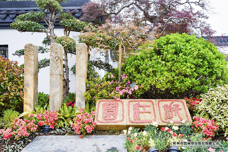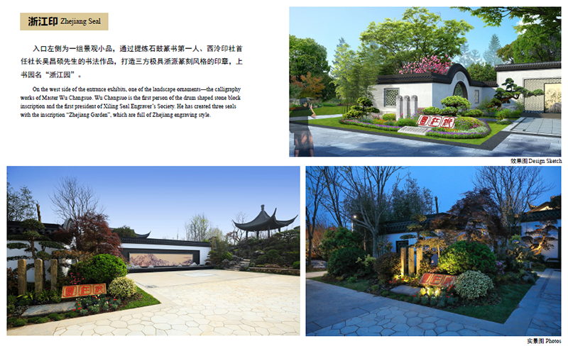位于浙江園主入口西側(cè)的景觀小品“浙江印”,提煉自石鼓篆書第一人、西泠印社首任社長吳昌碩先生的書法作品,三方極具浙派篆刻風(fēng)格的印章上,“浙江園”三個字,干凈、利落,古樸、大氣。這幅美景的背后,是深化設(shè)計團(tuán)隊數(shù)次往返西泠印社,從無數(shù)的篆刻名家作品中挑選、比對,決定采用最能代表浙江篆刻藝術(shù)的吳昌碩先生字體,從中找出“浙”、“江”、“園”三個字,在設(shè)計圖中反復(fù)比對,調(diào)整位置、大小,最終確定下來。