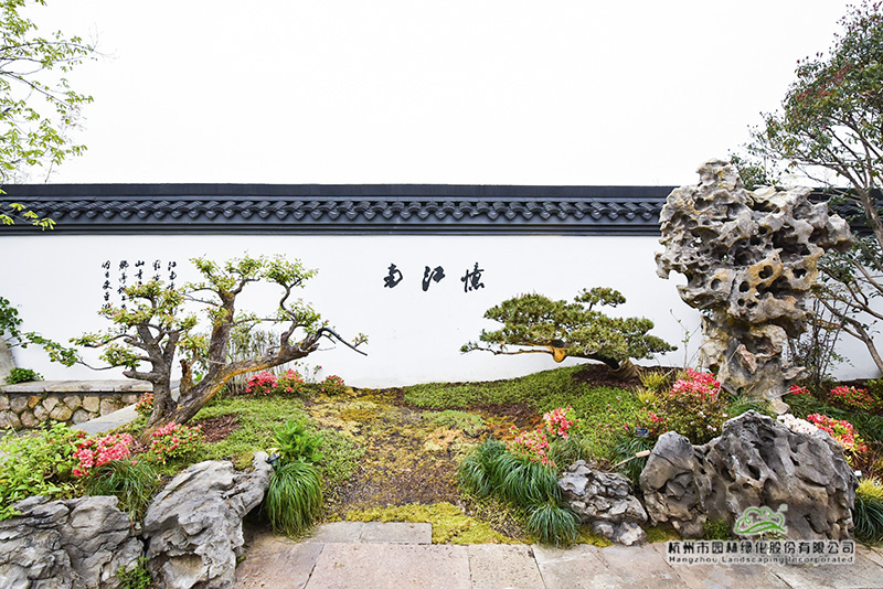 再往里走,富春山居照壁前的造型黑松和紅花檵木,一左一右,遙相呼應(yīng),樹姿優(yōu)美,枝干舒展,仿佛熱情歡迎遠(yuǎn)道而來的客人。這兩棵樹,是深化設(shè)計團(tuán)隊跑遍全國重要苗圃挑選回來的,讓最美的一面呈現(xiàn)在游客面前。