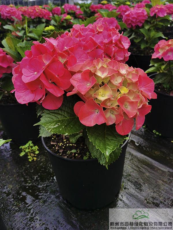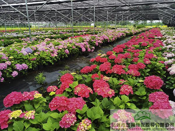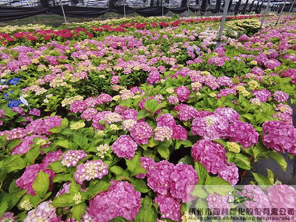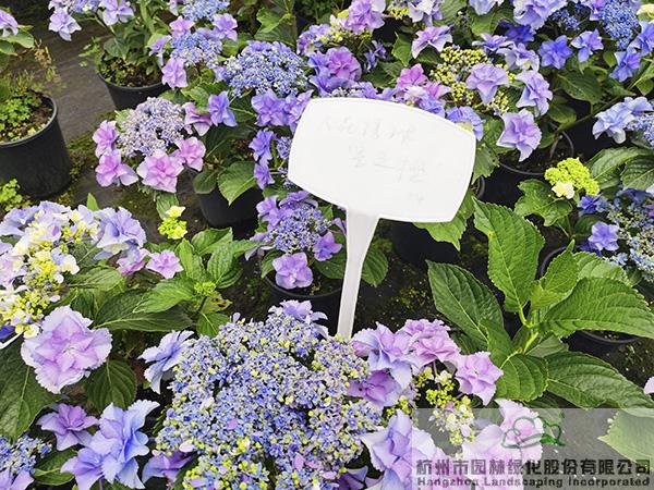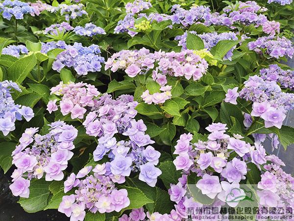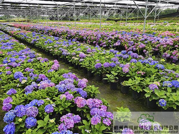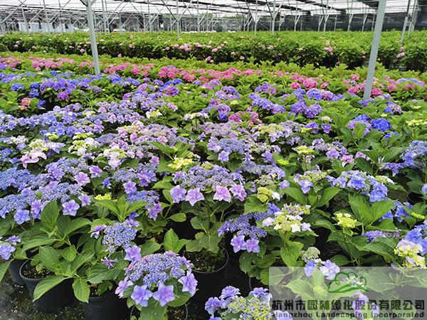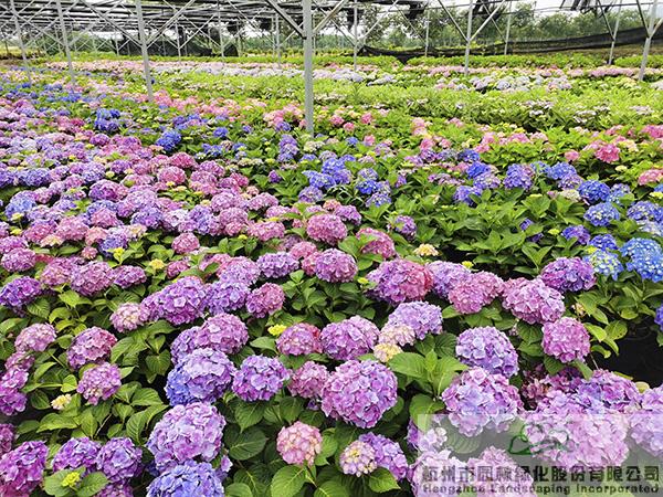 據悉,在畫境種業徑山基地,共有七八十個繡球品種,規格從1加侖到5加侖,能夠滿足家庭園藝和工程用苗的多種需求。通過近幾年的生產和繁育,徑山基地不斷篩選優良的繡球品種,目前,基地里的這些品種表現都比較好,比如紅色系的搖擺樂、漢堡、花神,花色紅艷,花朵碩大,在一眾繡球中表現非常搶眼;花色豐富多變、宛如一顆顆璀璨寶石的藍寶石和藍色媽媽;花朵宛如蝴蝶翩躚、花色充滿夢幻感的佳澄;花朵密集、猶如一大捧五顏六色爆米花的愛莎;開花早、花期長、花色漸變的藍色海洋;花開時,宛如一只只白色小鳥在枝頭紛飛的泉鳥;花團錦簇、花期超長的無盡夏……可以說,每一種繡球的花色、花形都各不相同,極具特色,充滿了夏日的浪漫情懷。