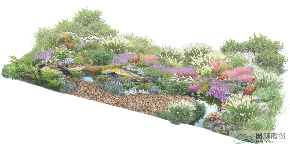以千鳥花、密花千屈菜、美女櫻等觀賞草本花卉為主,點綴以小兔子狼尾草等觀賞草,重現(xiàn)濕地草甸中繁花似錦的美麗場景。