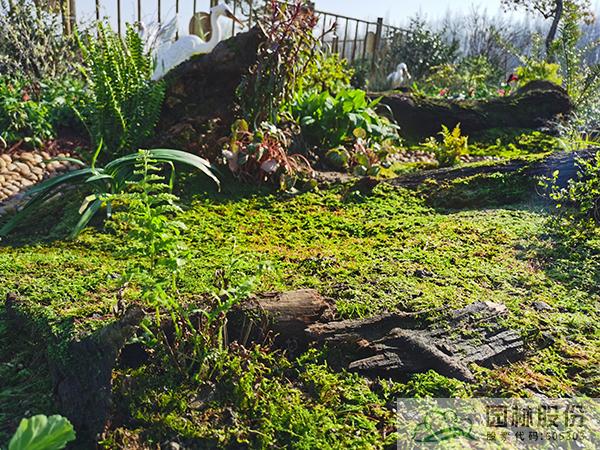 ①模擬苔蘚植物的生境條件,將蘚類濕地景觀與枯木結(jié)合,在枯木與卵石道路交叉部位布設(shè)小水塘,保持苔蘚生長環(huán)境土壤濕度。