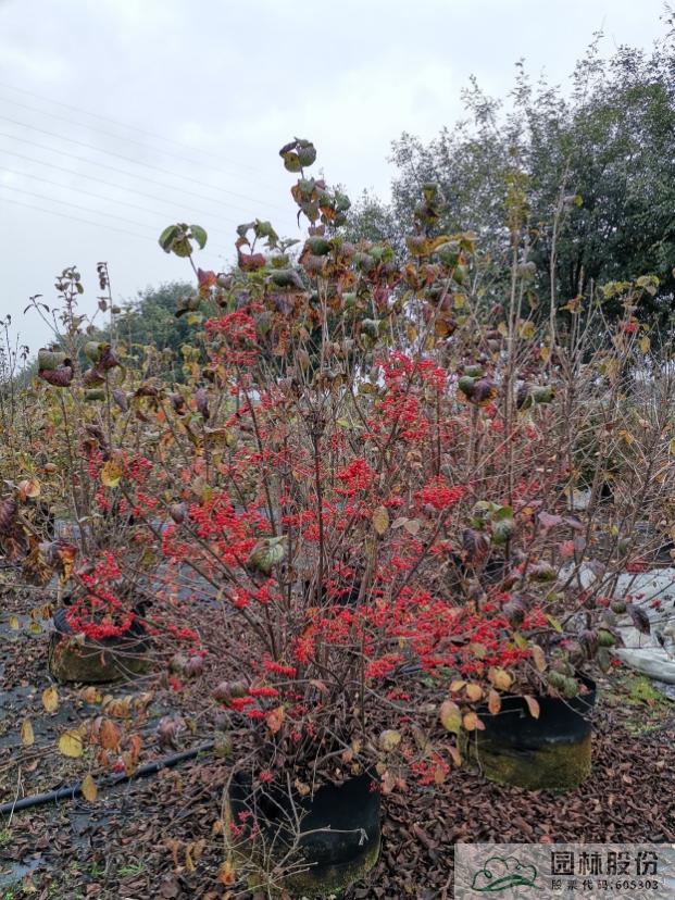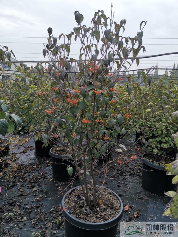 忍冬科莢蒾屬,落葉灌木,株型緊湊聚攏,直立性強。葉暗綠色,聚傘花序白色,春季開花。核果球狀卵形,果實顏色由綠色變成黃色,后逐漸轉成紅色,觀果期長,果量和果實直徑均較大。該種是莢蒾屬中觀果時間最長的物種。生長速度快,較耐修剪,耐寒耐干旱,適合工程應用或庭院觀賞。