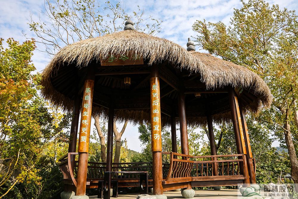 走出湖畔居,沿著山石小道拾級而上,來到“問茶”展區。伴著翠綠的茶葉和淡淡的茶香,登上杭州園的制高點——茅草雙亭。茅草雙亭有兩塊匾額,一塊是“問茶”,一塊是“聽泉”。“問茶亭”正前方的幾株茶樹是茶園的點睛之筆,設計靈感取自“西湖龍井十八棵御茶”。在亭子邊還有一處泉眼——“滌心”,“滌心”是乾隆皇帝御題的“龍井八景”之一,寓意溪水清澈,心靈清凈。