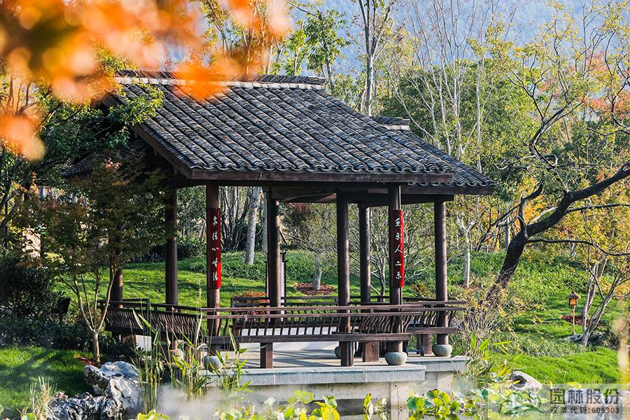 契合展區主題的樾香亭臨湖而立,雙坡屋面,八柱敞亭,柱子上書五言聯“魚樂人亦樂,泉清心共清”,盡顯悠閑舒適的情趣。在亭內憑欄而坐,側耳聽風雨,迎風嗅花香。抬頭遠望,荷葉亭亭的水面上,有魚兒在水中嬉戲;曲折的長橋上,游人在漫步觀景;水岸邊,銀杏、三角楓、烏桕等色彩繽紛,編織出一幅深秋的美麗畫卷。