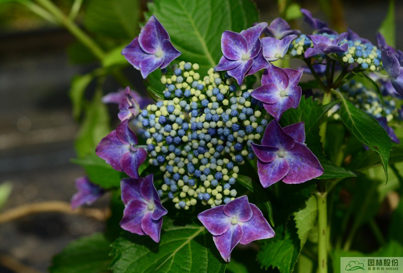 大葉繡球‘夢幻星空’:傘房狀聚傘花序盤狀,高度2~4cm,直徑10~12cm,上海及杭州5月中下旬開花,可延續(xù)至6月下旬;可孕花花瓣藍(lán)色;不孕花萼片先端白色至淺藍(lán)色中部藍(lán)色至紫色基部白色;花色夢幻,花型飄逸,適合家庭園藝和工程。
